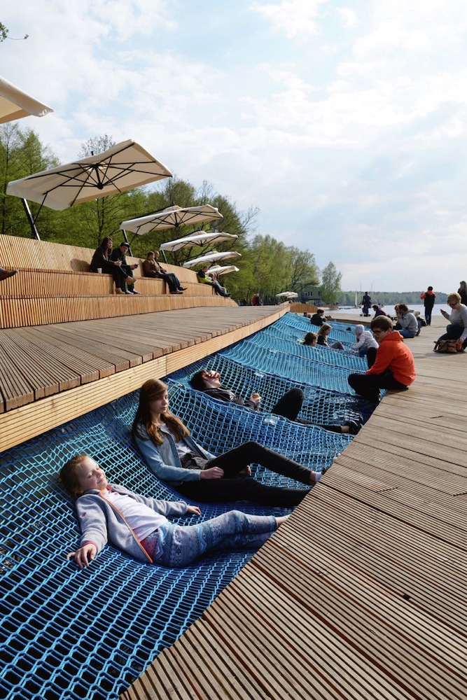 A punto de cumplir 20 años –se inauguró en 2014–, la orilla del lago Paprocany es uno de los espacios públicos más frecuentados por los habitantes de Tychy, en el suroeste de Polonia. RS + Robert Skitek diseñaron un paseo de madera que bordea la orilla, con tramos sobre el agua que cuentan con una red sobre la que tumbarte. El espacio se completa con una tribuna desde la que disfrutar las competiciones deportivas, una playa de arena y un gimnasio al aire libre, todo con elementos naturales y luces LED.