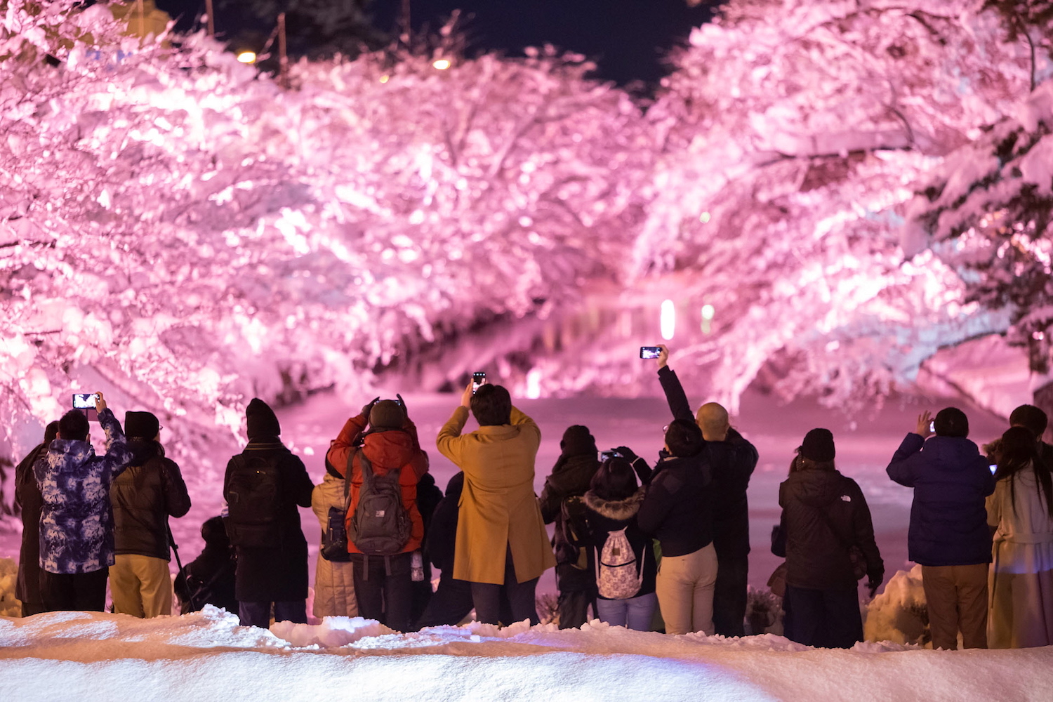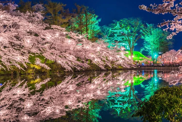 Para rizar el rizo en lo que a cerezos se refiere, a muchos enclaves no les basta con ofrecer un extenso manto de flores rosas; además, las iluminan con unos resultados realmente impresionantes. Es el caso del parque del Castillo de Takada, en Niigata, que, durante todo el mes de abril, ilumina sus 4.000 cerezos con más de 3.000 farolillos, un espectáculo cuya luz se refleja sobre el foso del recinto.
