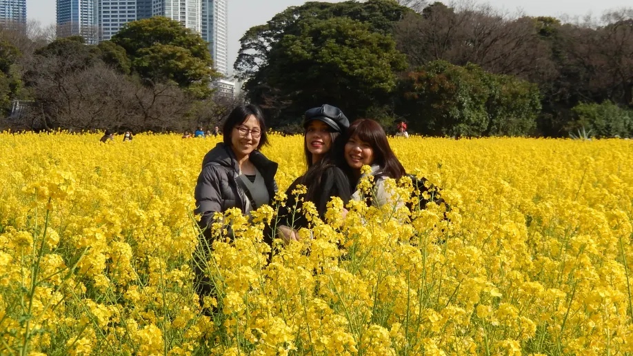 Las flores de colza (nanohana) anuncian la llegada de la primavera en el Japón más rural; por eso, caminar entre esta marea amarilla en una urbe como Tokio tiene un matiz especial. Aquí, en los jardines de Hama-rikyu, tienes un oasis con más de 300.000 flores de colza entre rascacielos. Hasta finales de abril también los puedes ver en Kurihama Flower Park, un parque de Yokosuka al sur de la capital.