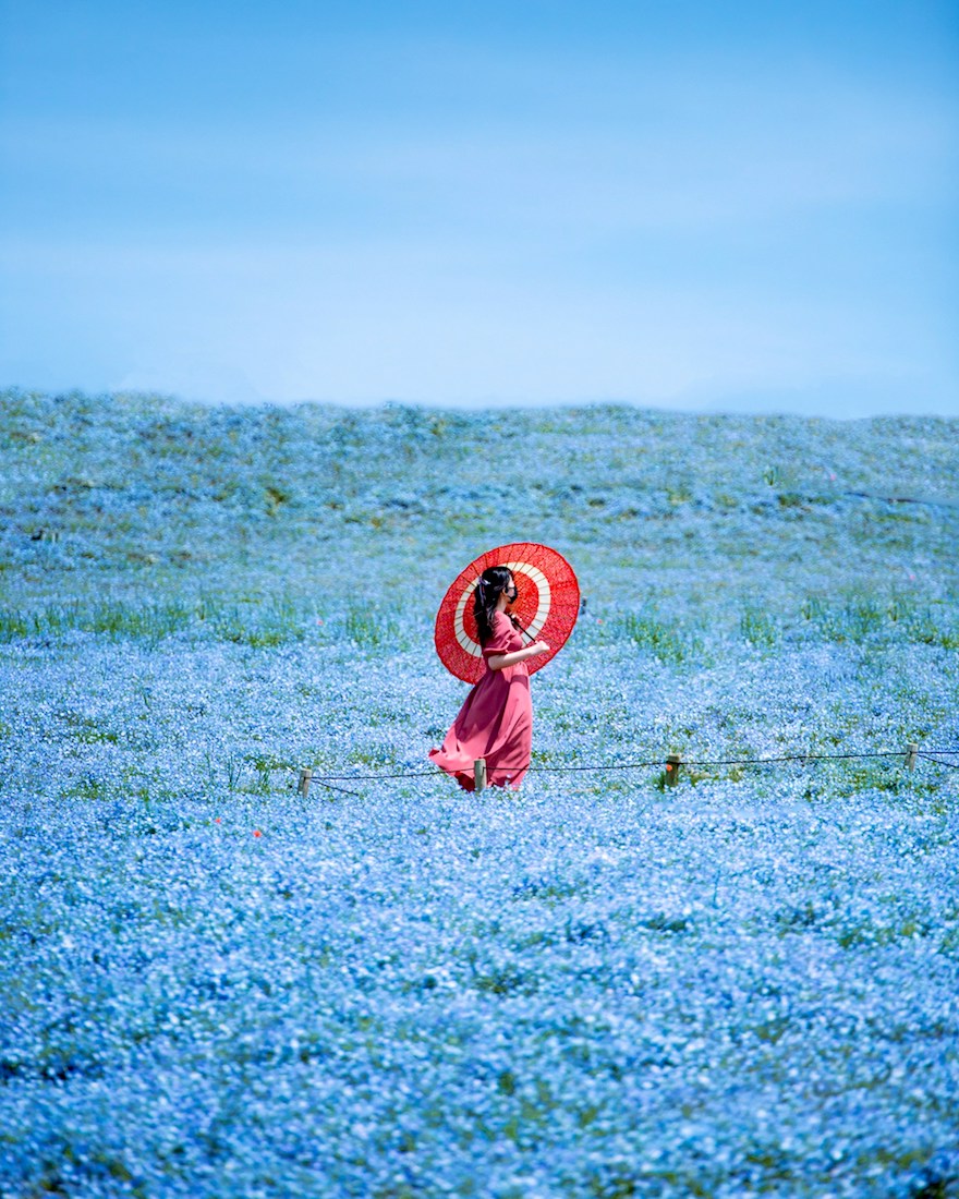 De mediados de abril a finales de mayo, el Parque Costero de Hitachi, en Ibaraki, se tiñe de azul con 5,3 millones de nemófilas. Estas pequeñas flores (ojos azules de bebé) cubren toda la colina Miharashi no Oka con una alfombra traslúcida que se funde con el azul del cielo y el del Pacífico, un mar de flores que fue base militar y que hoy, la CNN ha catalogado como uno de «los 36 spots más bellos de Japón».