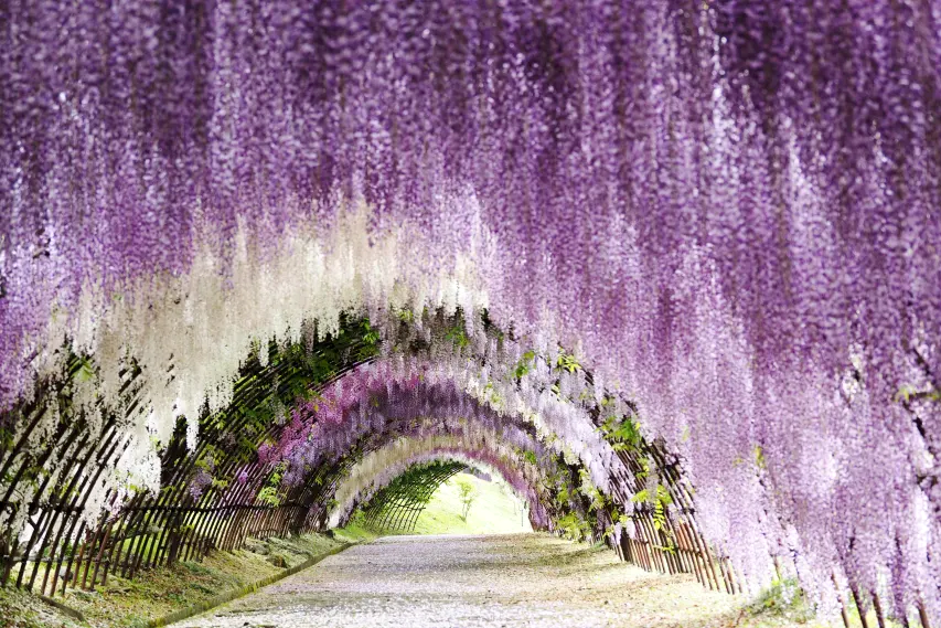 Una de las experiencias más oníricas que puedes realizar en estos días en Japón es atravesar una bóveda de glicinas. A principios de mayo, el Jardín de Kawachi Fujien, en la prefectura de Fukuoka, concentra más de 150 árboles de 22 especies diferentes de glicinas y wisterias, un mundo mágico que crea dos túneles de hasta 100 metros de largo con flores colgantes y muros morados, malvas y blancos.