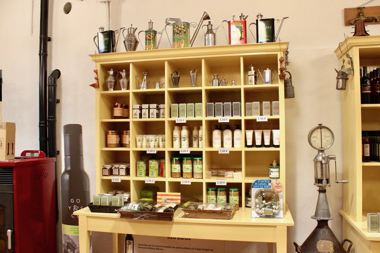 Toda esta cultura que gira alrededor de este aceite de oliva virgen extra del Bajo Aragón se materializa en una tienda propia donde comprar casi todo lo que puedas imaginar en el universo aceite, comenzando por el primera cosecha y el virgen extra –comercializado en lata– y continuando por los condimentados –con trufa, albahaca, guindilla…– y las aceitunas y patés. Dentro de la oferta cosmética, puedes elegir jabón de manos, cacao de labios, crema corporal…