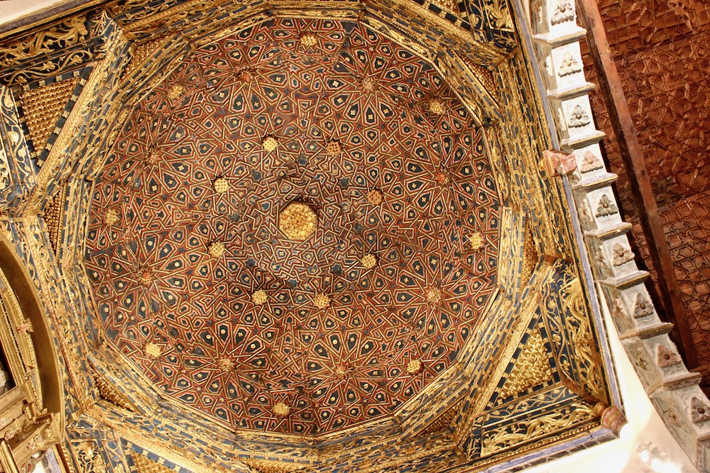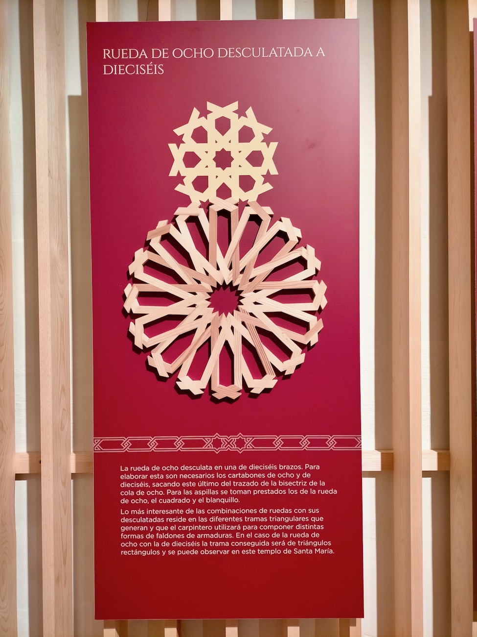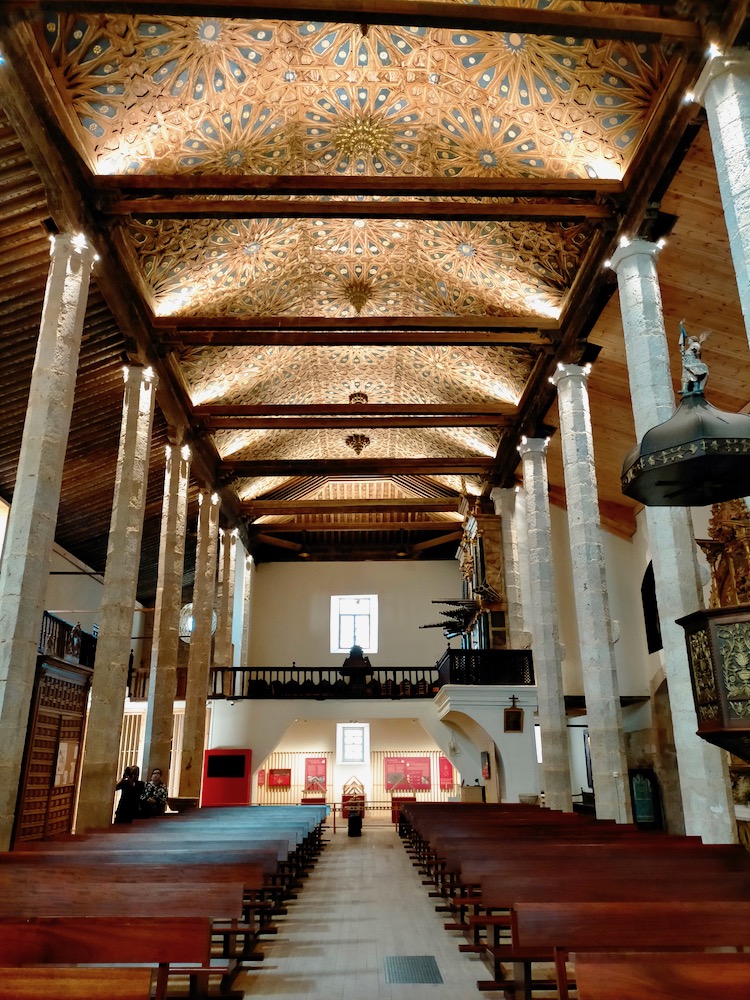 Si los artesonados mudéjares de Cisneros te han impresionado, saber cómo se ejecutaban te dejará sin palabras. Puedes descubrirlo en la iglesia de Santa María de Fuentes de Nava –a poco más de 25 km de Cisneros–, última parada de nuestra ruta. Aquí, en su centro de interpretación, te contarán todo sobre este arte geométrico que se realizaba encajando las piezas, como un puzzle, y que no precisaba pegamentos ni clavos. Esta compleja sucesión de elementos repetitivos, como fractales, se completaba a veces con pintura, creando joyas como este artesonado mudéjar policromado de Santa María.