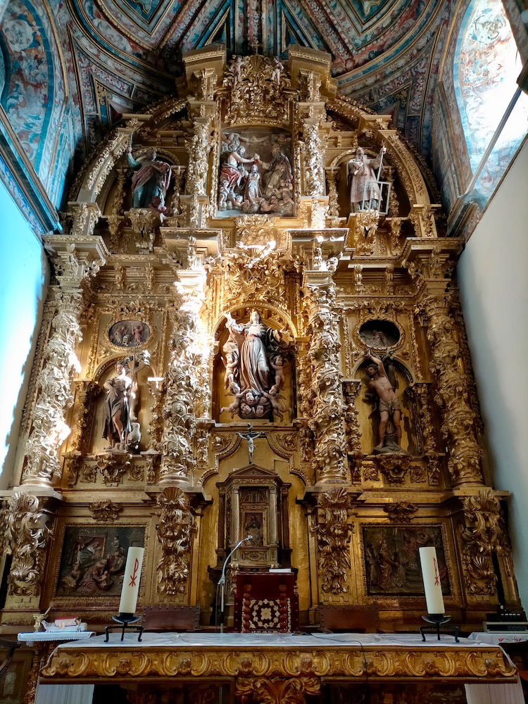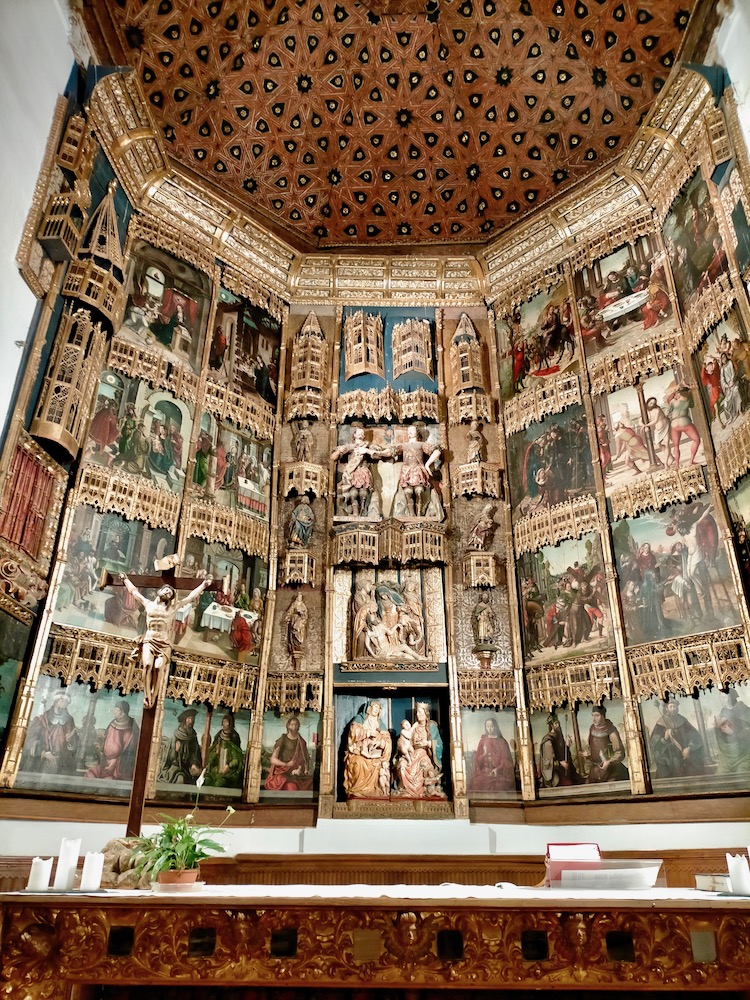 Lo primero que atrapará tu atención es el espléndido Retablo Mayor, con las pinturas del Rey David, el Rey Salomón y el Rey Ezequías, firmadas por Pedro Berruguete. De su genio nacen también otras pinturas sobre tabla, como la serie de los Evangelistas y dos que reflejan la vida de Santa Elena. Además, el órgano –obra de Tadeo Ortega, de 1780– y esculturas tan magistrales como el Abrazo de San Joaquín y Santa Ana –de Alejo de Vahía–, la perfección de los ropajes y el rostro de la Virgen con el Niño –de Alonso Berruguete– y el Ecce Homo de Martínez Montañés y su realismo barroco.