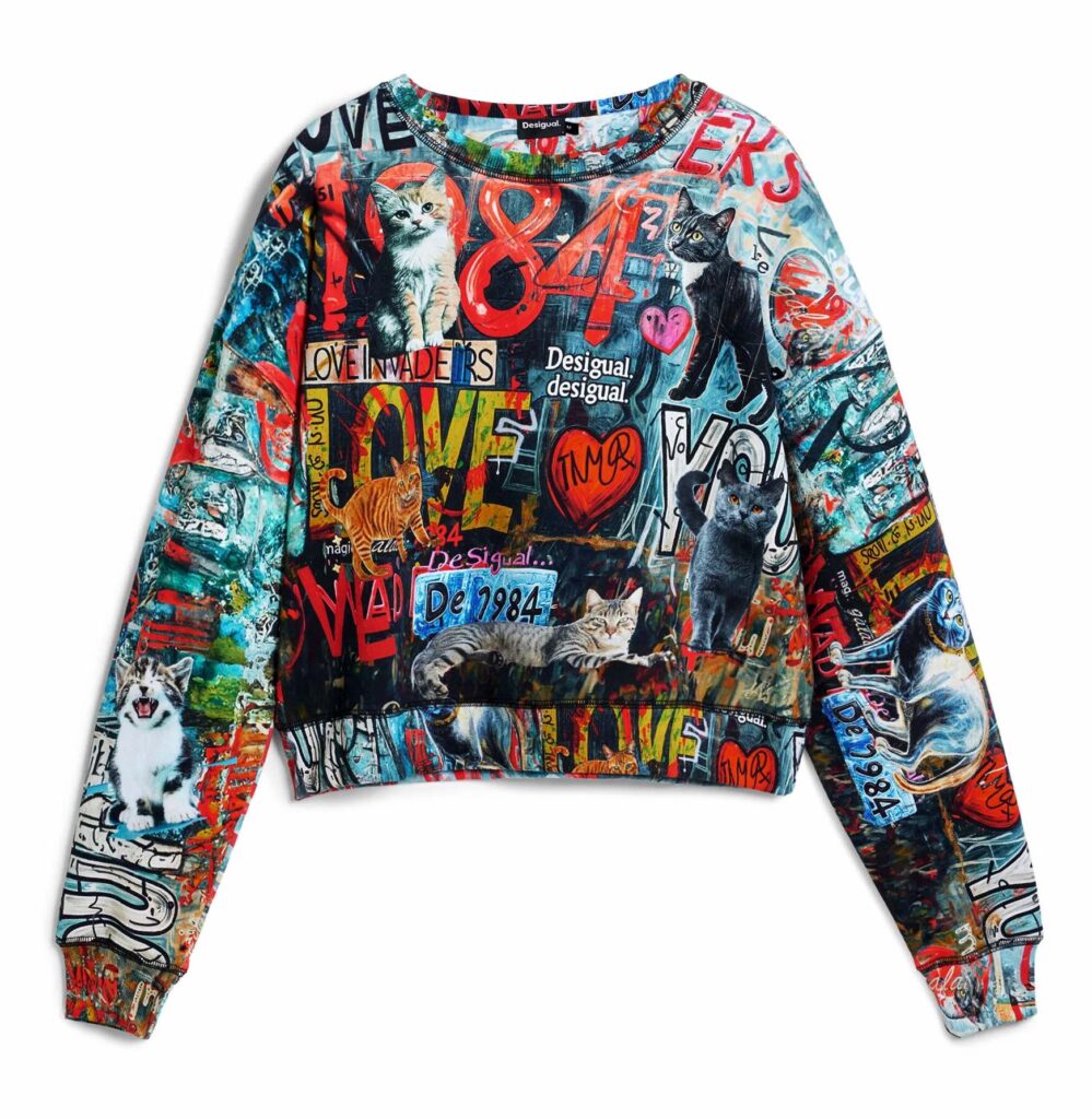 Tanto si la discrección no es lo tuyo como si buscas un regalo por el que te recuerden, ficha esta sudadera de algodón y corte cropped, con estampado de grafitti efecto desgastado. En Desigual, 79,95 €