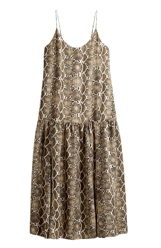 Ha compartido pasarela en las últimas temporadas con el animal print leopardo pero, en esta, el ESTAMPADO DE SERPIENTE gana por goleada. Búscalo en tops, blusas, faldas o en total look, como este vestido largo y suelto, con tirantes spaguetti. En H&M, 34,99 €