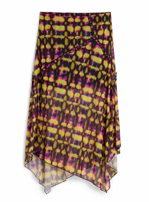 Si te gusta el juego de la insinuación y prefieres dejar entrever a mostrar, seguro que te embarcas en las TRANSPARENCIAS, una de las tendencias de la temporada. Las de esta falda midi, además, añaden estampado geométrico y corte asimétrico, otros dos básicos de la primavera. En Desigual, 79,95 €