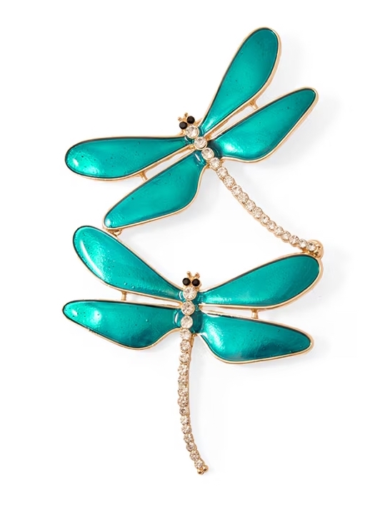 El tamaño XXL que ya te hemos contado la pasada semana aterriza también en los BROCHES para ponerlos de moda, sobre todo si son como este, con dos libélulas gigantes color verde pato en zinc y cristal. En Sfera, 9,99 €