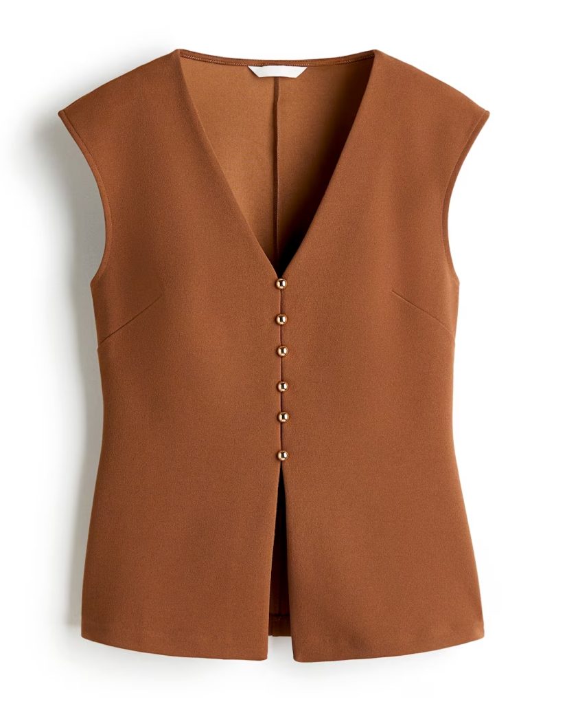Es marrón –uno de los colores de la temporada–, ligero y súperversátil, pero, sobre todo, este chaleco Interlock con botones dorados derrocha estilo. En H&M, 17,99 €