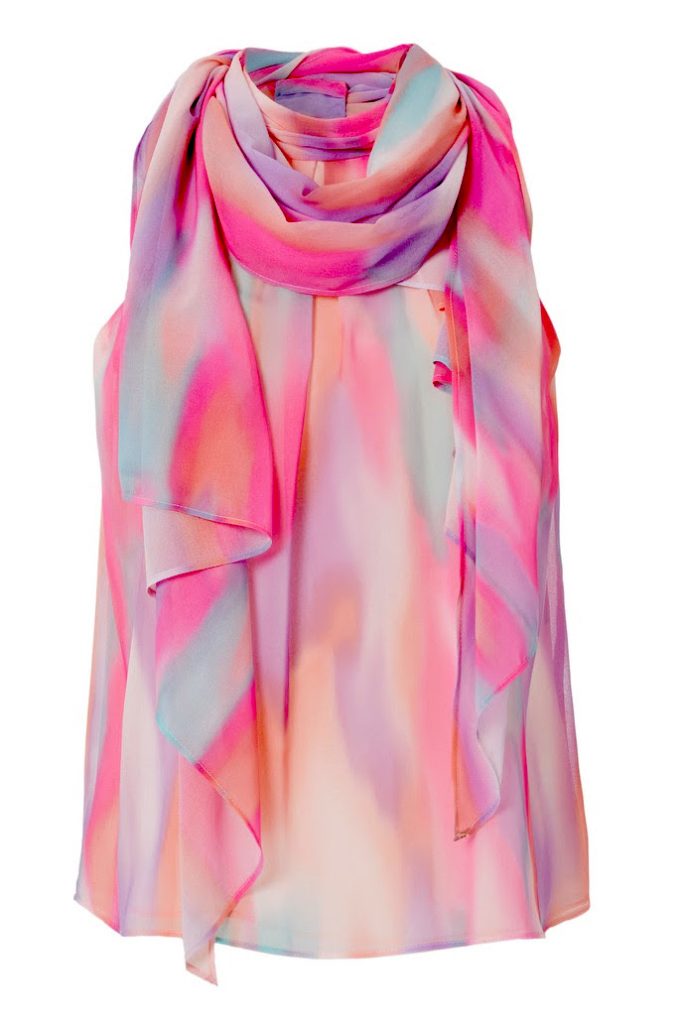 Si eres de las que prefiere tonos lisos para las partes de abajo, una blusa tye dye como esta, en tonos rosas y morados y con lazada, quedará perfecta para el momento after beach. En Laura Bernal, c.p.v.
