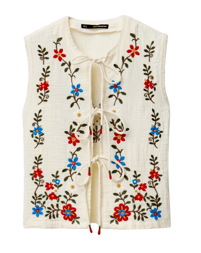 ¿Hoy estás bohemia? Entonces, no podrás resistirte a este top con flores bordadas y atado con cordones, perfecto para un outfit hippy. En Sfera, 25,99 €