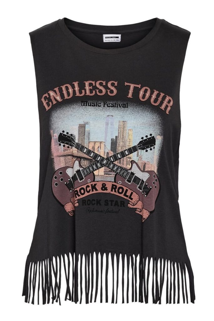 Tanto si vas de escapada a un concierto como si el cuerpo te pide una buena dosis de rock’n’roll, échale un vistazo a esta camiseta gris con flecos y estampado rockero. En Springflield, 14,99 €