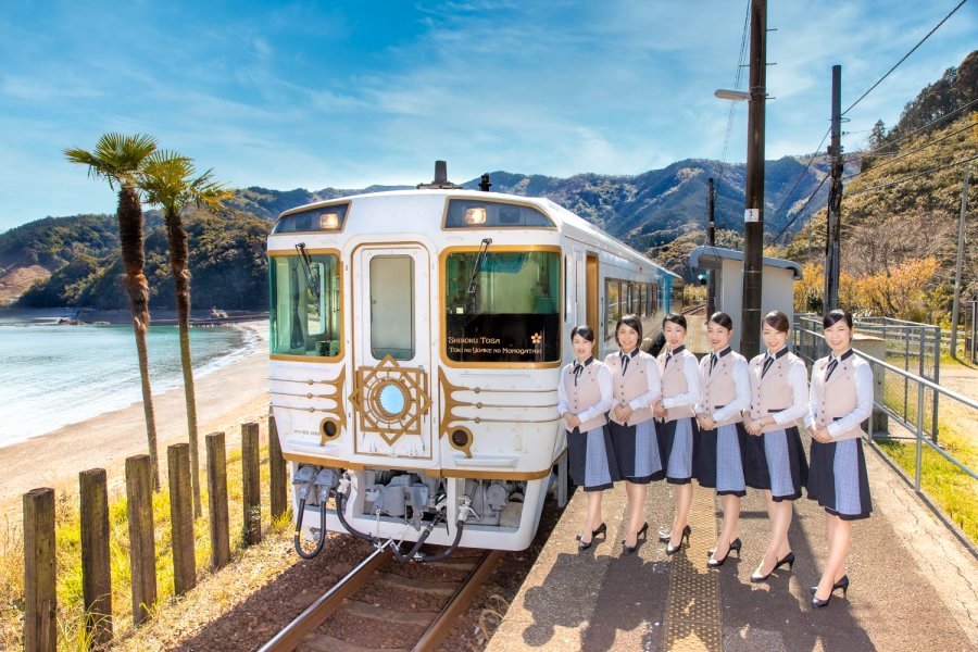 Desde las llanuras de Sanuki hasta las aguas de un intenso verde esmeralda del río Yoshino: no podrás apartar los ojos de la intensa película real que se ve desde las ventanillas de Shikoku Mannaka Sennen Monogatori. El tren –cuyo diseño está inspirado en la fruta madura o la hierba brotando– conecta costa y montaña, una de las rutas más exuberantes del país, que puedes acompañar con comida de la zona.