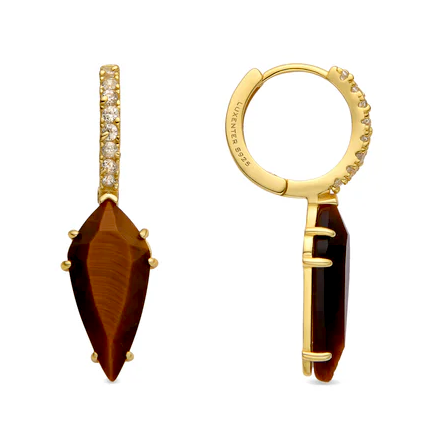 Pocos diseños concentran en una sola pieza lo clásico y lo moderno como estos pendientes con ojo de tigre, realizados en plata de ley 925 y acabado en oro de 18K. En Luxenter, 79,90 €