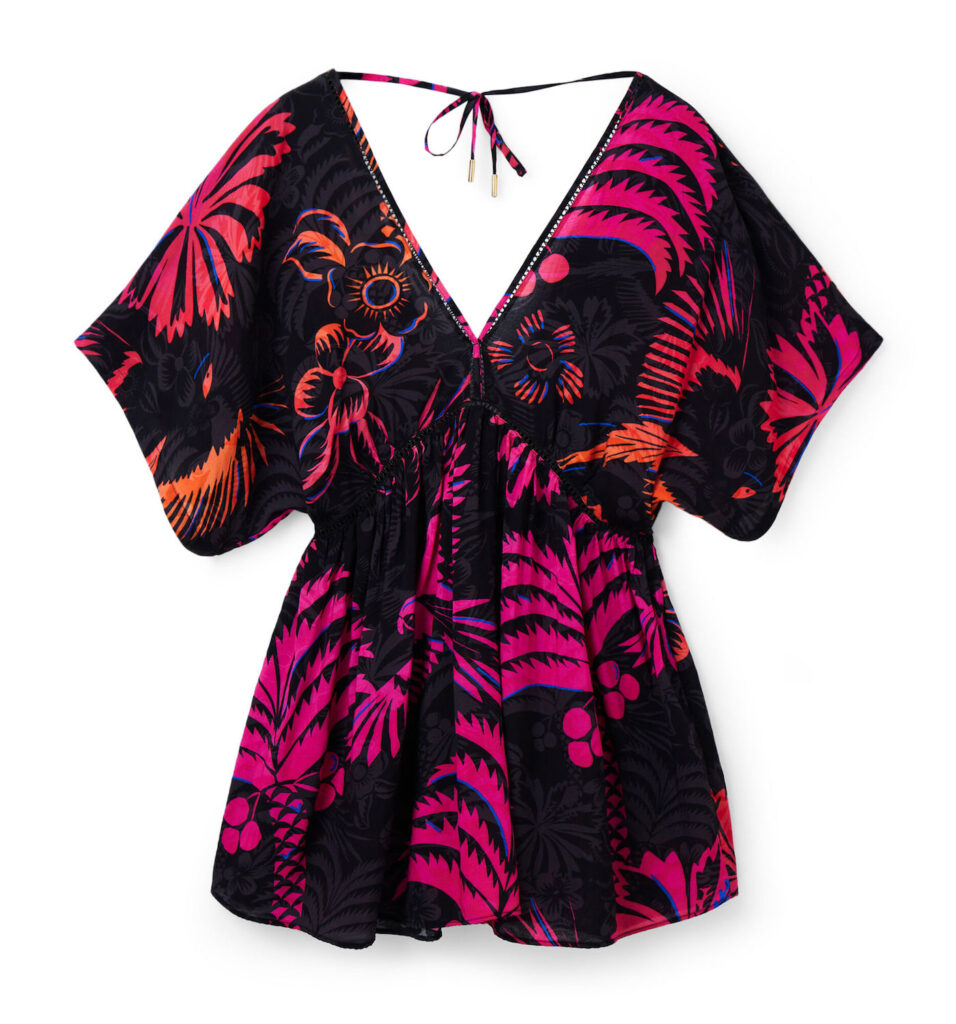 Llegar e irte de la playa se va a convertir en un momento muy especial gracias a este vestido túnica de estampado tropical. En Desigual, 48,97 €