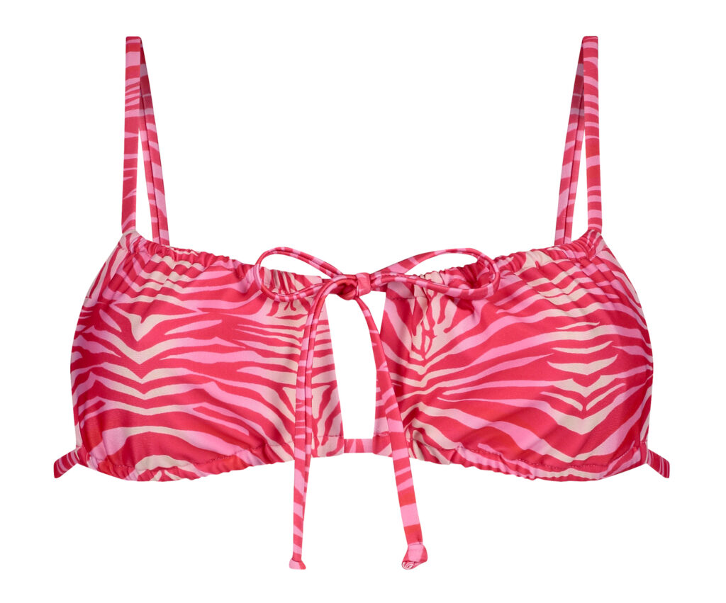 Los chapuzones serán más divertidos con el top de bikini Chile, sin aros, con print de cebra rosa y ajustable con tiras. En Hunkemöller, 15 €