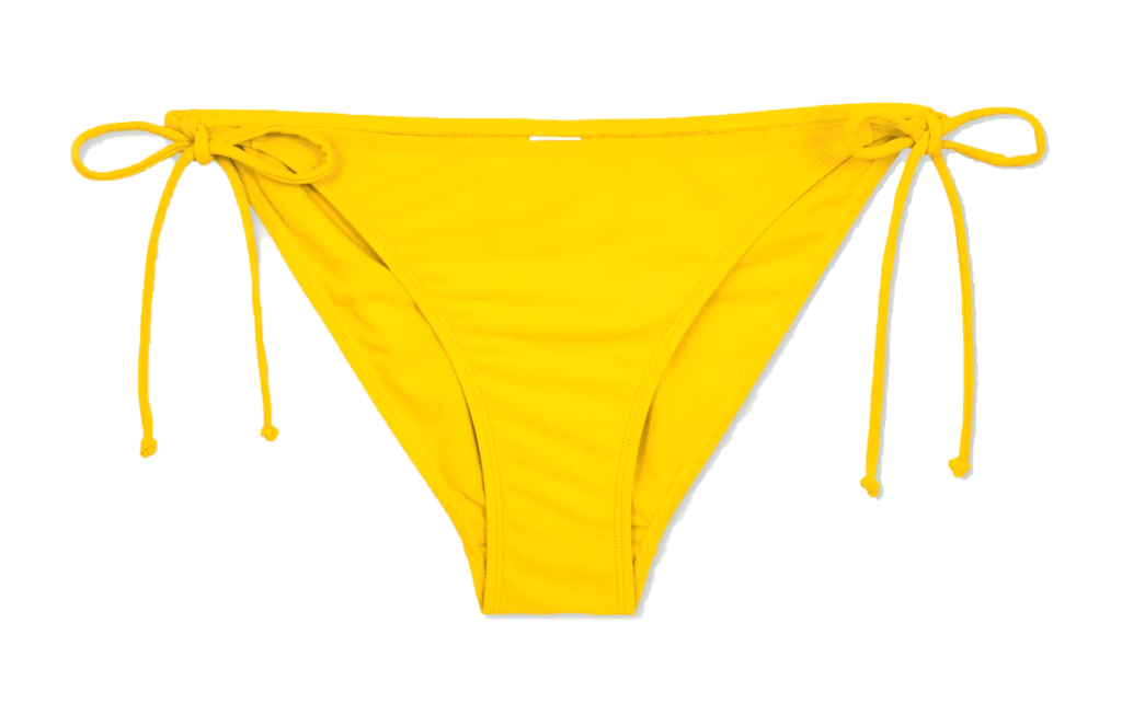 Ecológica, fabricada con al menos un 50% de poliéster reciclado y en un vibrante amarillo. Así e esta braguita de bikini con lazos laterales. En Primark, 5 €