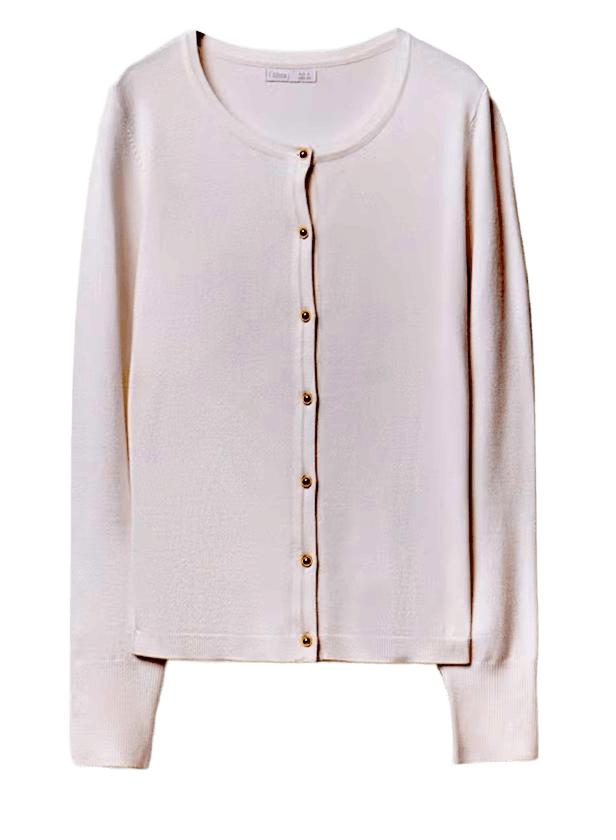 Un básico universal de fondo de armario es una chaqueta de punto abierta con cuello redondo. Esta, además, tiene minibotones dorados y está confeccionada en viscosa blanca. En Sfera, 19,99 €