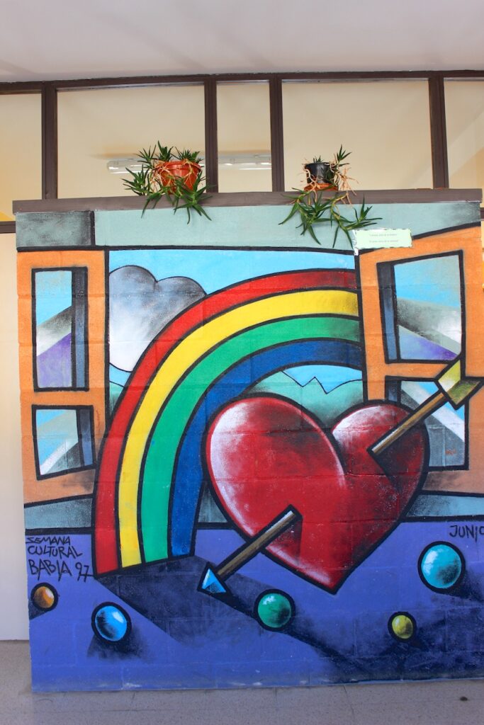 Para ver en directo la obra del pintor, muralista y diseñador gráfico Manuel Sierra no hace falta ir a un museo. La propuesta de Lolo, como le llaman, llena de corazones, barcos y plantas las paredes del colegio de Huergas de Babia en una obra en la que han colaborado todos los alumnos del centro. Si te suena este estilo naif y vitalista estás en lo cierto: Sierra también firma los carteles de la Asociación Estás en Babia, desplegados por toda la comarca, un mural en las calles de Lago de Babia, etiquetas de vino de la zona…