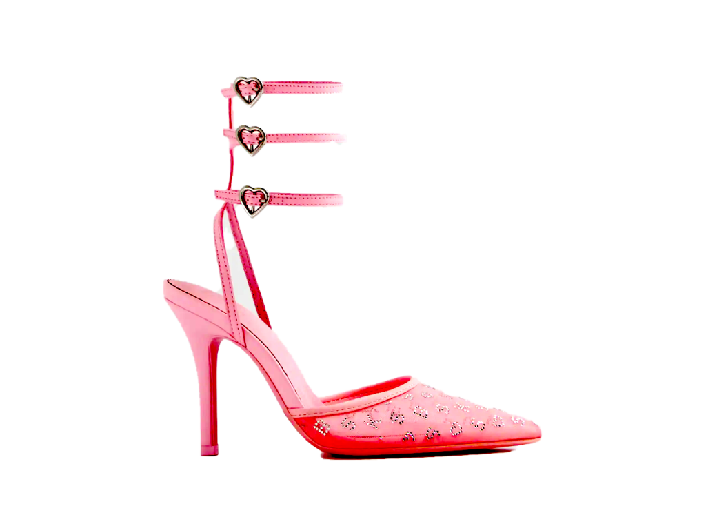 Los corazones se rendirán a tus pies con estos zapatos de tacón, con brillos y pulseras con hebilla en forma de corazón. En Bershka, 39,99 €