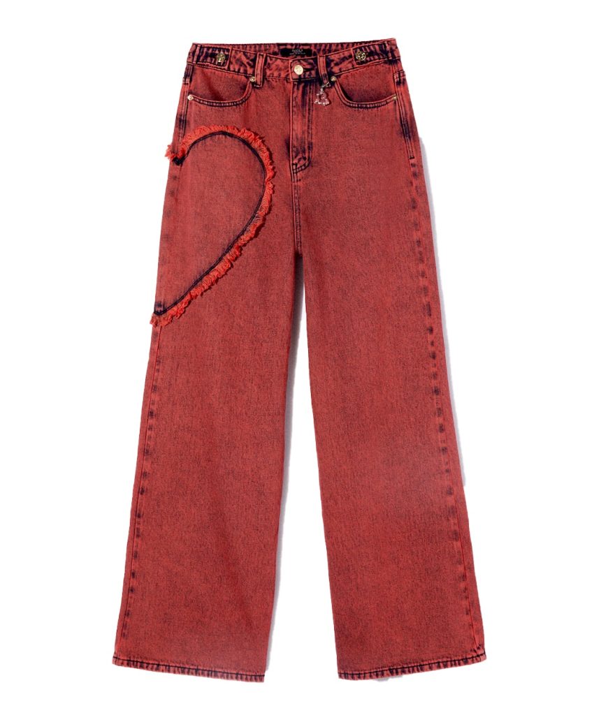 Este pantalón vaquero lo tiene todo: la rudeza del denim, un color tan inusual como el rojo y un corazón gigante en el lateral. En Parfois, 39,99 €