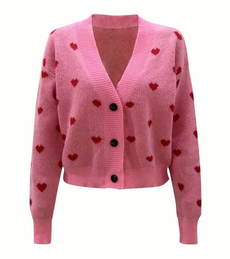 Los corazones rojos de este cárdigan de punto no podían encontrar mejor fondo que un romántico todo rosa. En Temu, 20,49 €