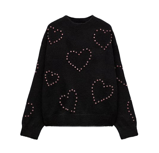 Con unos cargo o una mini, este jersey de punto con abalorios en forma de corazón combina con todo. En Zara, 29,95 €