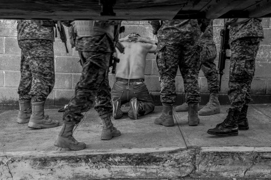 Un hombre es detenido por la policía el 27 de marzo de 2022, el día en que la Asamblea Legislativa salvadoreña aprobó el estado de emergencia. Desde entonces, más de 80.000 personas han sido arrestadas en El Salvador, donde el encarcelamiento masivo y la sobrepoblación carcelaria es la norma.
