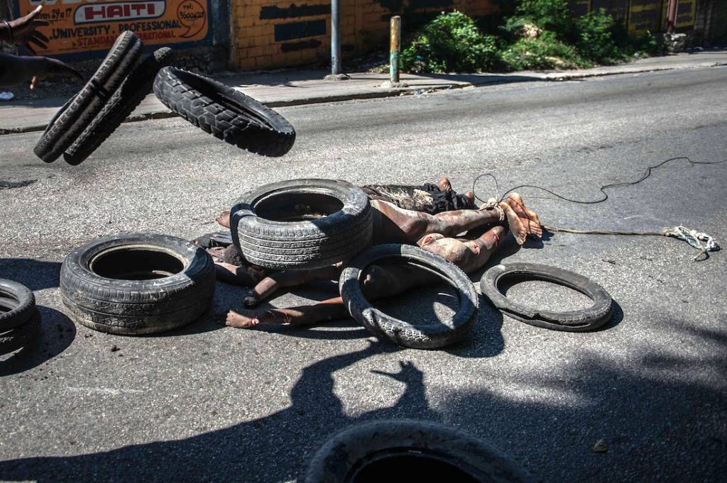 Un residente arroja neumáticos en Puerto Príncipe, Haití, en noviembre de 2024, sobre los cuerpos de presuntos pandilleros abatidos por la policía. Es parte de la violencia extrema de las pandillas, una crisis arraigada en el pasado colonial del país y en la gran deuda de independencia impuesta por Francia.