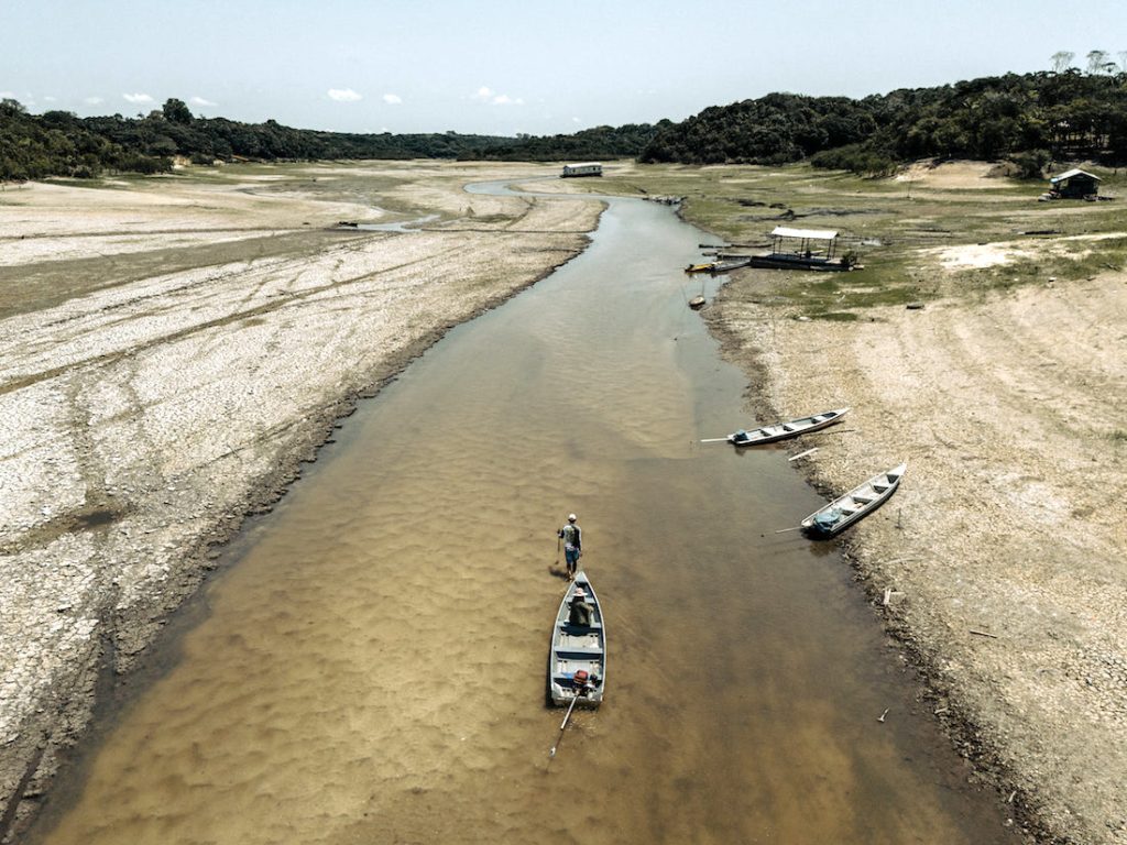 Un hombre arrastra un bote por aguas poco profundas en São Francisco de Marina, en octubre de 2024. La sequía ha encallado casas flotantes y ha hecho casi imposible el transporte fluvial en Manaos, Brasil, con una escasez extrema de agua en este río y el abandono de la tierra por parte de los colonos.