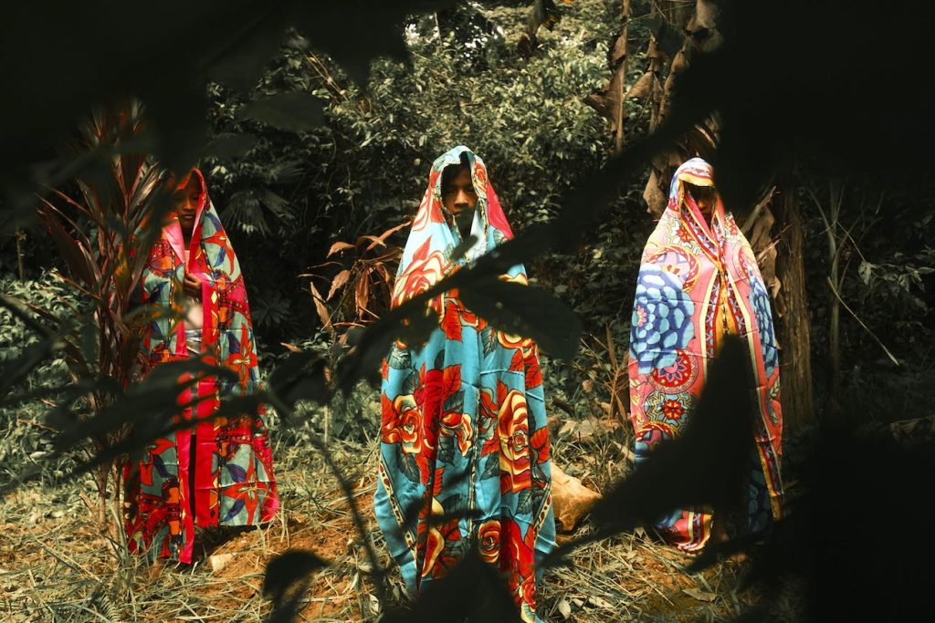 María Camila, Luisa y Noraisi Birry en junio de 2024, en la tumba de su hermana Yadira, con los chales que ella dejó. Yadira Birry, –se quitó la vida a los 16 años con un chal paruma– forma parte del creciente índice de suicidios de los emberá dobida, indígenas nómadas de Colombia que malviven en la capital.