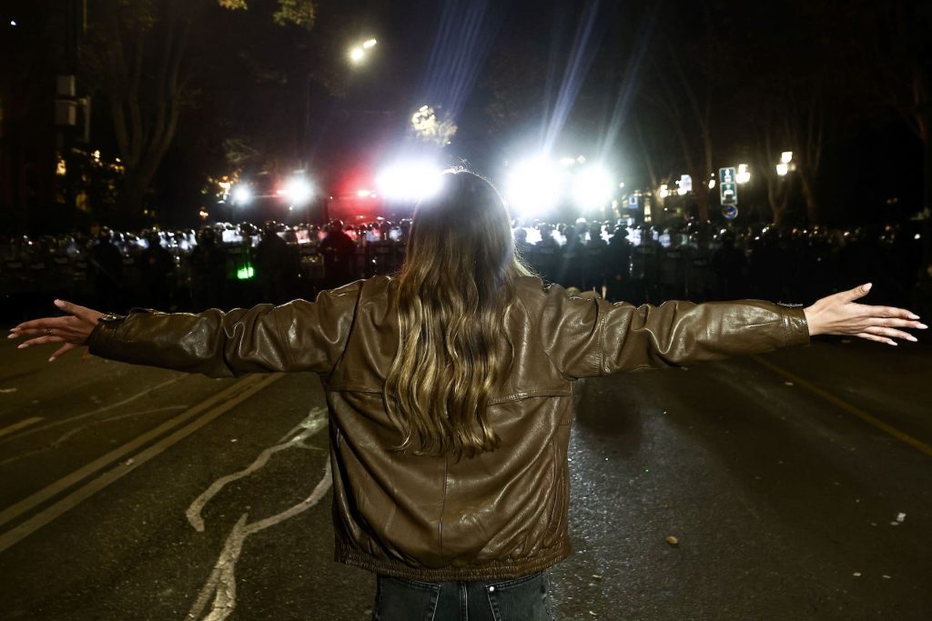 Una mujer se enfrenta a los antidisturbios durante una manifestación frente al Parlamento de Georgia, en Tiflis, en diciembre de 2024. La policía había desplegando cañones de agua para dispersar a los manifestantes, cuyas protestas comenzaron tras suspender las negociaciones de adhesión a la UE.