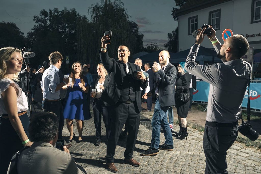 Miembros y simpatizantes del partido AfD –Alternativa para Alemania, de extrema derecha y corte nacionalista y antiinmigración– cantan una canción con letra reescrita sobre la deportación en un incidente investigado por la policía por incitación al odio. En Potsdam, en septiembre de 2024.