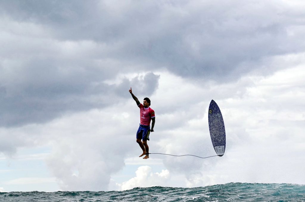 El brasileño Gabriel Medina emerge triunfante de una gran ola en la quinta serie de la tercera ronda de surf masculino, durante los Juegos Olímpicos, en julio de 2024. La imagen, tomada en Tahití, en la Polinesia Francesa, se convirtió en un icono y obtuvo 9,5 millones de likes en el Instagram de Medina.