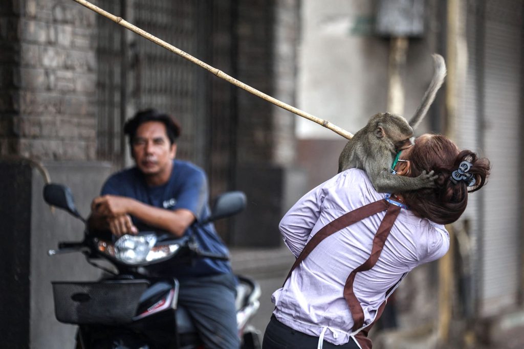 Un macaco de cola larga ataca a un empleado frente al templo Phra Prang Sam Yot, en Tailandia, en febrero de 2024. Aunque en Lopburi los macacos traen buena suerte, la falta de turistas (y comida) durante el COVID-19 los volvió tan agresivos que las autoridades han decidido esterilizarlos.